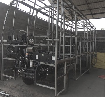 As per the required design the aluminium tubes, GI sheets and other raw materials are prepared by cutting, forming, bending and other processes in the press shop. First of all by using the aluminium tubes, coach structure was assembled. It was dropped on the chassis and welded it completely by attaching requirements as per design. It is the 35% of the overall process. The about all constitutes of sub assembly.